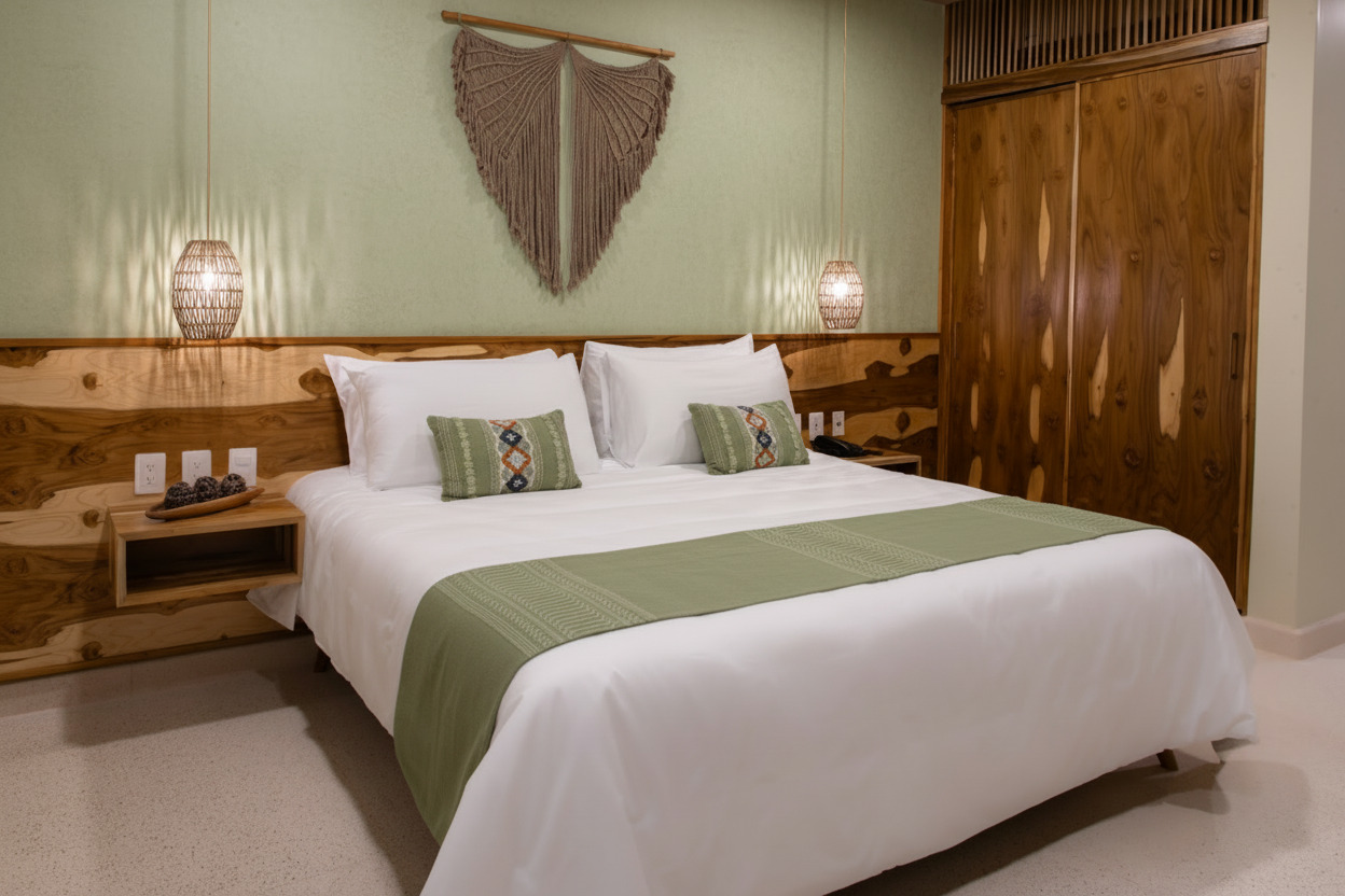 La luna toca la piel del aire. En esta suite, la luz se expande hacia la terraza y el jade se mezcla con el cielo. La sala y el sofá-cama invitan a la conversación pausada, mientras el jacuzzi celebra la quietud bajo las estrellas. Aquí, el descanso se eleva — libre, luminoso, profundo. Por el momento, esta habitación no cuenta con jacuzzi en funcionamiento.