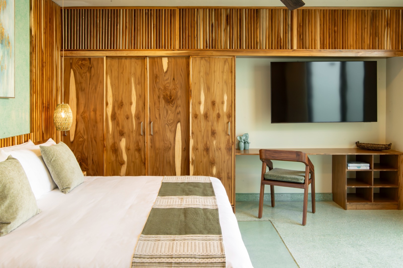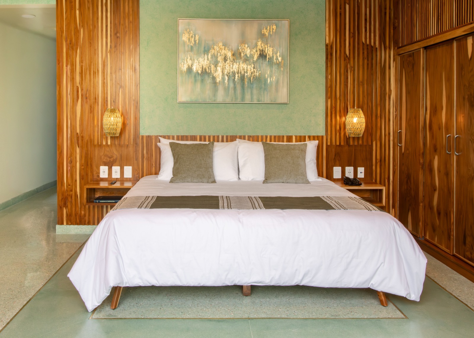 El jade se vuelve refugio. En esta suite, el silencio se abre paso entre muros cálidos y un patio que respira calma. La sala invita a la pausa, el sofá-cama guarda historias compartidas, y el jacuzzi convierte el tiempo en ritual. Aquí, el descanso tiene raíces: íntimo, sereno, eterno. Por el momento, esta habitación no cuenta con jacuzzi en funcionamiento.